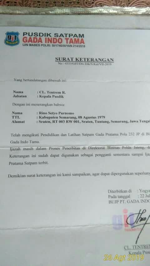 Foto dokumen Surat kelulusan Diklat satpam Gada Pratama dari Pusdik Satpam Klaten Jawa Tengah. Dilarang keras bagi kamu menjiplak, mengcopy, ataupun memperbanyak foto dokumen pribadi milik Rino ini !!!!!