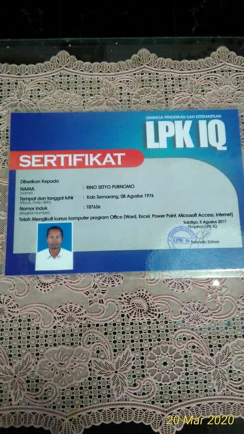 Sertifikat kursus komputer milik Rino Setyo Purnomo yang dari LPK IQ Salatiga,Jawa Tengah.
