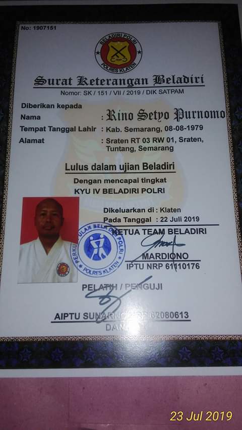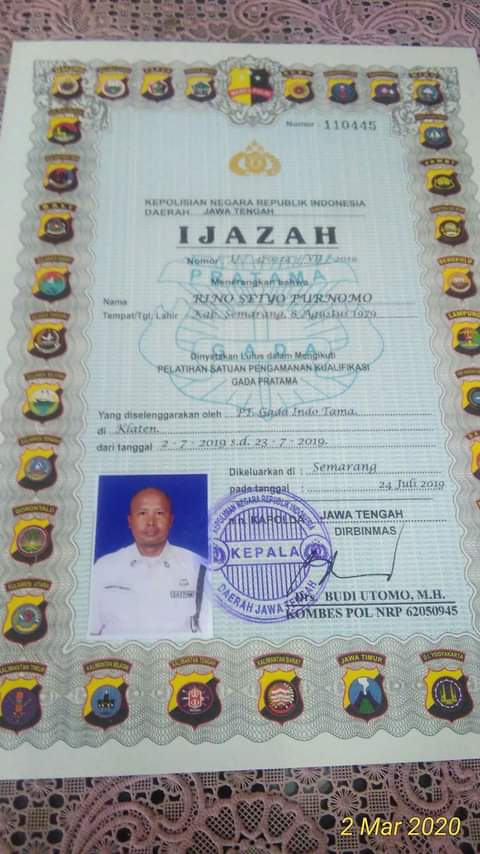 Rino Setyo Purnomo adalah Alumni lulusan Diklat Satpam Gada Pratama Tingkat Polda Jawa Tengah angkatan ke 45 di PUSDIK SATPAM BUJP PT.GARDA TOTAL SECURITY, Klaten Jawa Tengah.